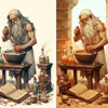tall for a gnome, skinny long haired librarian working with some mortar and pestle to create a concoction he is reading from an ancient manuscript