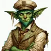 A small, wiry goblin with sharp features, wearing a sailor's hat and tattered vest. His skin is a mottled green, his eyes are bright and mischievous, and he sports a sly grin.