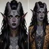 A husky, middle-aged Tiefling woman with piercing green eyes, sharp features, and long, raven-black hair. Her skin is a greyish-red, and a five'o'clock shadow. She wears fine robes adorned with intricate gold embroidery and carries an aura of wealth and power.