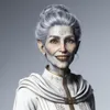 An elderly woman, with silver hair neatly tied in a bun, soft brown eyes, and wearing a modest clerical robe adorned with faint glyphs of her faith. Her skin is grey, and her teeth are brown and rotting.