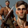 A tall, muscular fifteen-year-old with deep-set blue eyes and short, brown hair. His skin is sun-tanned from relentless training and harsh conditions. Each movement suggests strength and readiness, yet carries a youthful uncertainty. Dressed in a hand-me-down, rugged uniform that speaks of countless battles, he clutches a worn family heirloom sword as a testament to his commitment.