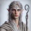 A gaunt, tall figure with almond-shaped piercing blue eyes and cascading hair resembling woven silver threads, his ethereal features betray an otherworldly sharp intelligence. Dressed in flowing robes adorned with arcane symbols and carrying an intricately crafted staff that hums faintly with latent energy, Moriel's every move seems calculated, like threads unraveling a complex tapestry of reality.
