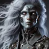 Luar. Their eyes glow with an unnatural luminescence, a hint to the secret buried in their soul. High cheekbones and an almost skeletal frame add to their otherworldly aura. Dressed in an antique bureaucratic garb adorned with complex technological interfaces, they move with a ghostly grace that belies an underlying weight of immense knowledge. Their hair, an amalgamation of white and silver strands, hangs in a disarray that feels intentional, capturing the essence of their role as a caretaker of forgotten secrets.