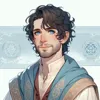a handsome male with wavy dark hair, blue eyes that sparkle with curiosity, broad shoulders, and kind features. He often dons the traditional robes of Candlekeep, embroidered with arcane symbols, and carries a journal filled with notes and sketches. His demeanor is approachable and friendly, with an aura of calm wisdom.
