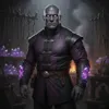 A full-body portrait of Reve Adler, a male Dueregar General. He stands with an unyielding posture, his 5'2" frame dense with the muscle of a lifelong laborer. His skin is the color of deep ash, stretched taut over a broad face with a square, determined jaw. He is completely bald, his scalp and brow etched with faint, geometric scars that catch the light. His eyes are a piercing, pale lilac, devoid of pupils and glowing with a subtle, internal light. He wears masterfully crafted merchant's attire of dark purple and black leather, adorned with polished silver clasps that resemble crystalline structures. Embedded in the skin of his thick forearms are tiny, glowing shards of purple crystal, a visible sign of his unique craft. The background is his dimly lit forge, filled with strange tools and racks of glowing, pulsating purple crystals.