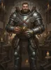 A towering Giant of a man, standing just over eight feet tall, with a broad, powerful frame. His face, framed by a short, neatly-trimmed brown beard and kind, intelligent eyes, often bears a hopeful expression, though it is tinged with weariness. His hands are large and calloused, stained with grease and marked by the scars of his craft, yet they move with surprising delicacy. He wears a suit of custom-forged, heavy steel plate armor, visibly worn and dented from numerous altercations. The armor is a masterpiece of function over form, integrated with various tools, conduits, and articulated plates. Etched prominently on the left gauntlet is the symbol of his oath: a gear encircling a single, unblinking eye.