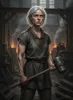 A full-body portrait of a celestial female cleric, Seraphel, standing in a gritty, industrial setting. She has the build of a laborer, with toned, strong arms and a sturdy posture. Her face, framed by short, messy, silver-white hair, is perpetually etched with a wary, untrusting expression. Her large, golden eyes, the only overt sign of her celestial heritage, constantly flinch and dart around, scanning for threats. Faint, silvery scars, like cracked porcelain, trace complex, geometric patterns across her neck and forearms, disappearing beneath the collar of her simple, heavy-duty work tunic. She holds a heavy mallet in one hand, her knuckles bruised and calloused. She looks exhausted but resilient, a fallen angel trying to blend in with mortals.